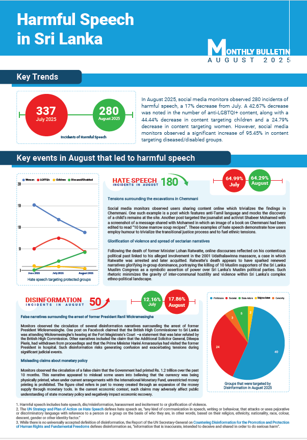 The August 2025 Bulletin on Harmful Speech in Sri Lanka details the latest insights on trends related to harmful content online, including hate speech and mis/disinformation.