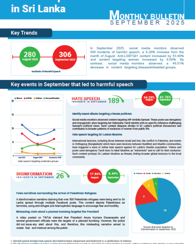 Breadcrumb Home / Resources / Publications / Harmful Speech in Sri Lanka: Bulletin #11 Publication Harmful Speech in Sri Lanka: Bulletin #11 30 October 2025 The September 2025 Bulletin on Harmful Speech in Sri Lanka details the latest insights on trends related to harmful content online, including hate speech and mis/disinformation. Published by RCO English File type: PDF Downloads: 34 Goals we are supporting through this initiative Related Resources Resources 01 December 2025 Sri Lanka Tropical Cyclone Ditwah: Flash Update No. 3 Resources 01 December 2025 Sri Lanka: Tropical Cyclone Ditwah - Flash Update 1 Resources 01 December 2025 Sri Lanka: Tropical Cyclone Ditwah - Flash Update 2
